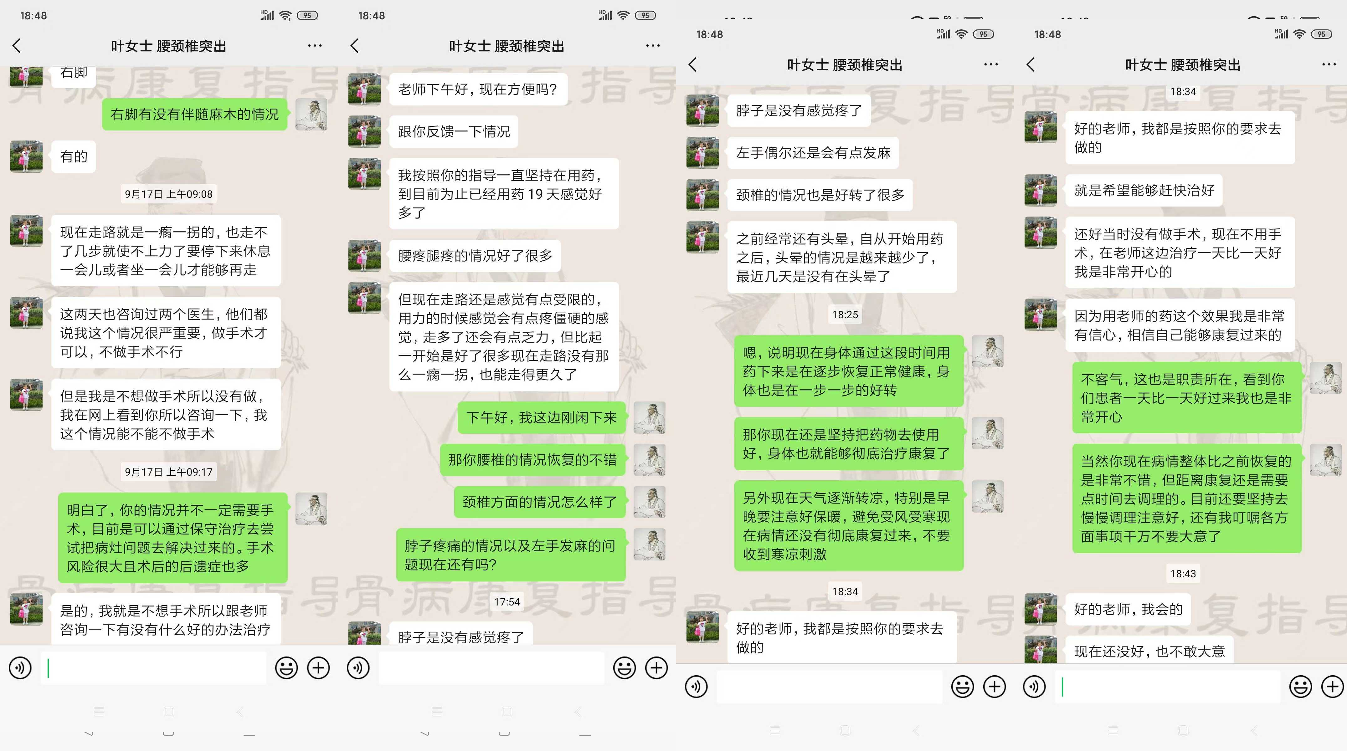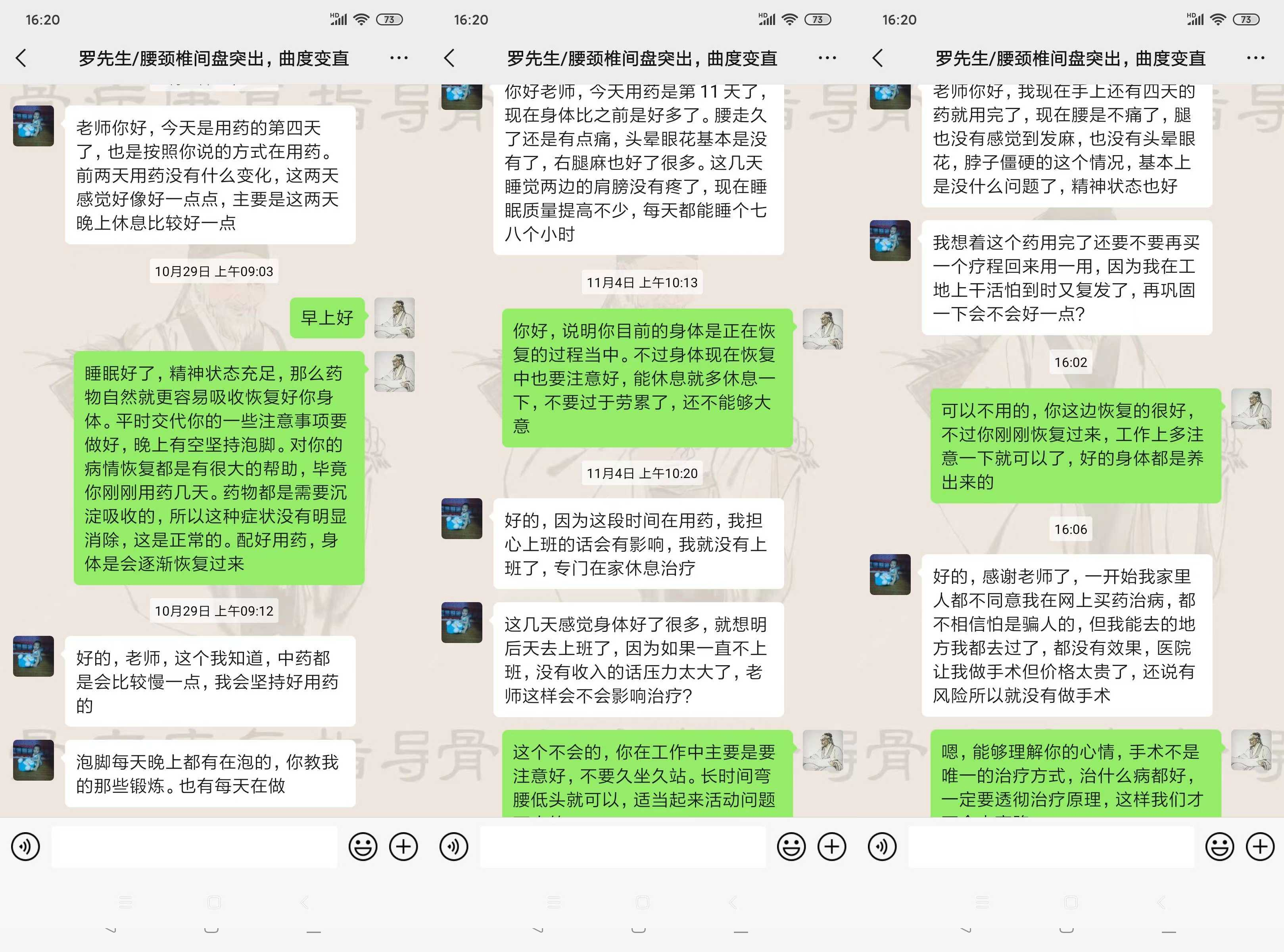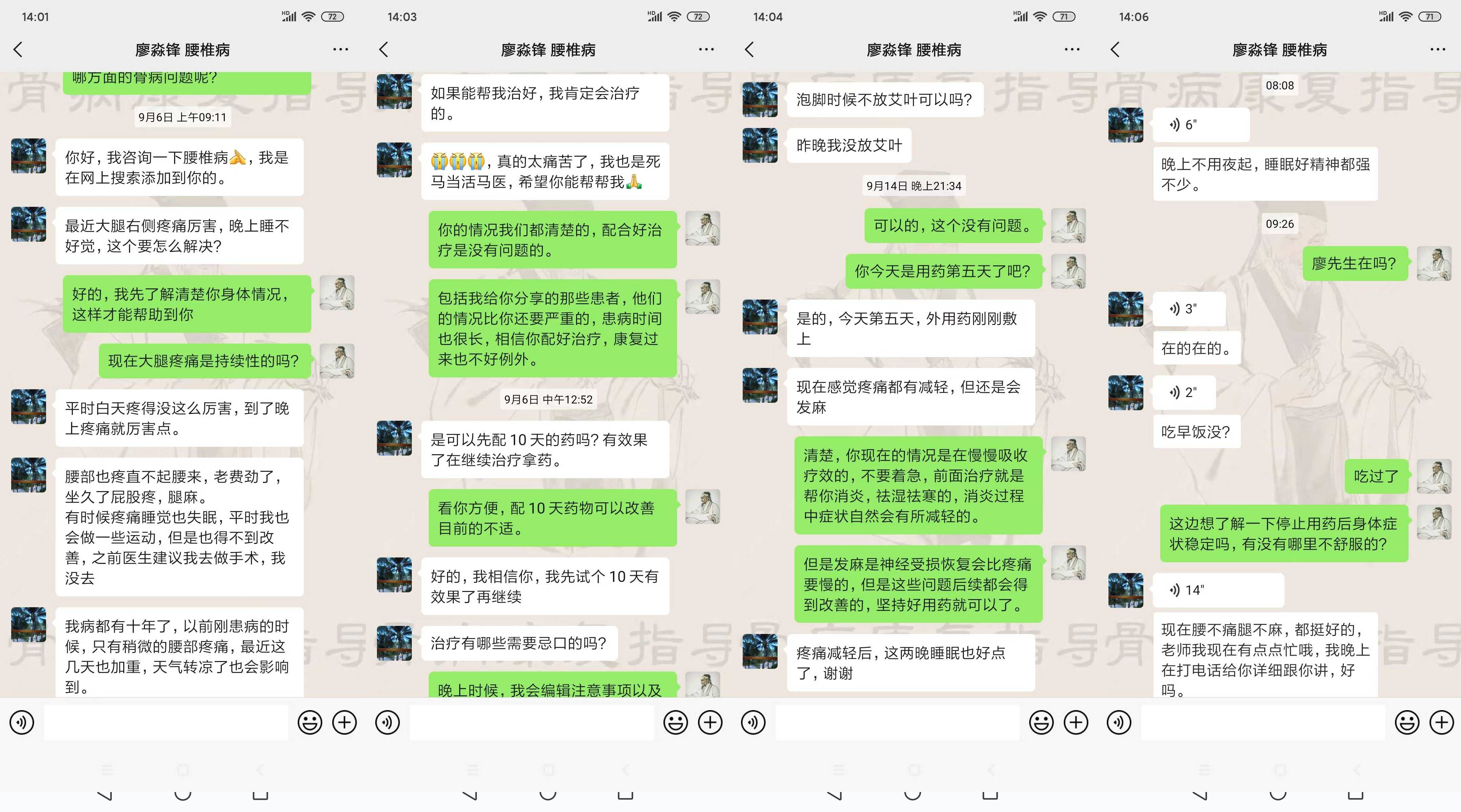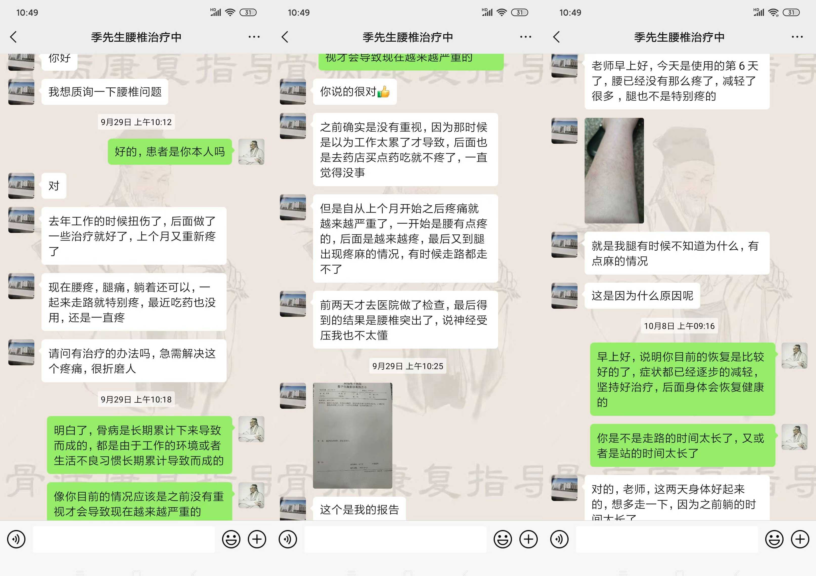 晚上聚餐的时候,大学校友董军跟我说:有一个古方,治疗腰间盘突出症效果很好,之前他丈母娘就是腰突压迫坐骨神经痛,就是用这个方法保守好的。我听到这个消息很开心,就问他哪里有这个古方。他说目前医院没有引进这个治疗项目,给了我一个骨病康复指导老师的微信,让我自己加上问问,他丈母娘就是通过这个老师治好的腰间盘突出、坐骨神经痛。