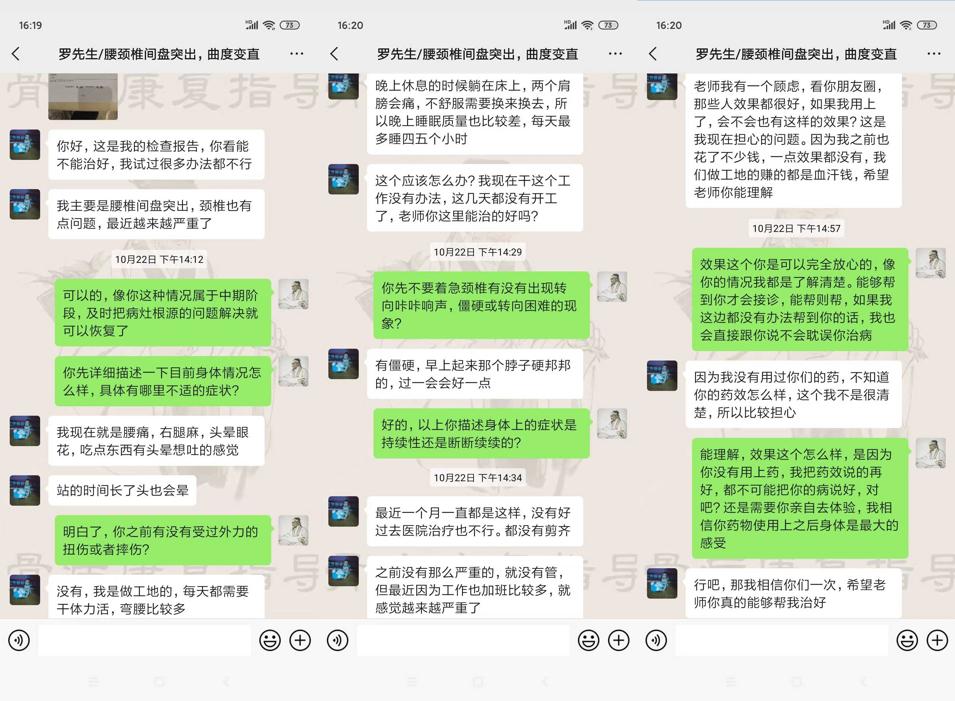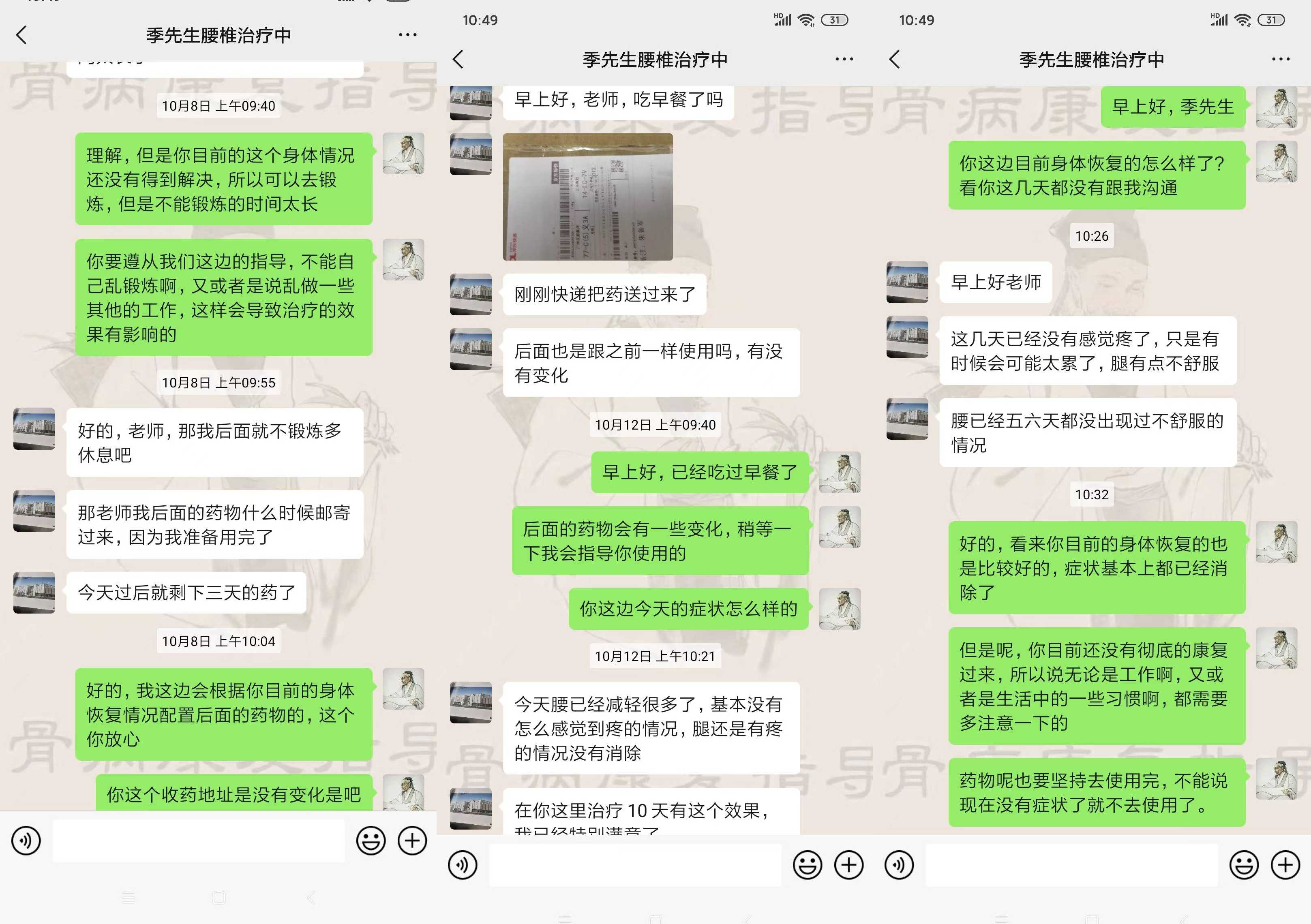 我回到上海第一时间就添加了骨病康复指导老师的微信,询问了治疗原理,老师也问了我病情,通过沟通老师的专业水平我也比较认可。于是当即订购了一个疗程的量,快递包邮到家非常方便。