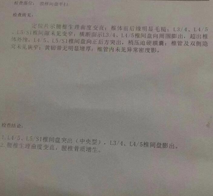我费力地缓缓站起身,脱下手术衣,让师弟完成后面的手术。然后又麻烦放射科的兄弟给我做了个核磁。结果比我想象中还要严重:腰5骶1中央型突出。