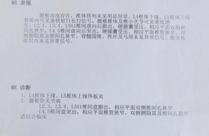 当时吃了点消炎止疼药和营养神经的药物,不管用。这种情况已经没法正常工作了,于是请假回家静养,给自己开了一些骨科常规药物,同时做着理疗,半个多月症状有所缓解,本来以为控制住了,没想到不到一星期就复发了,腰疼的晚上不敢翻身,白天坐一会屁股大腿根疼的受不了,小腿到脚背窜麻,这都是腰突的典型症状。