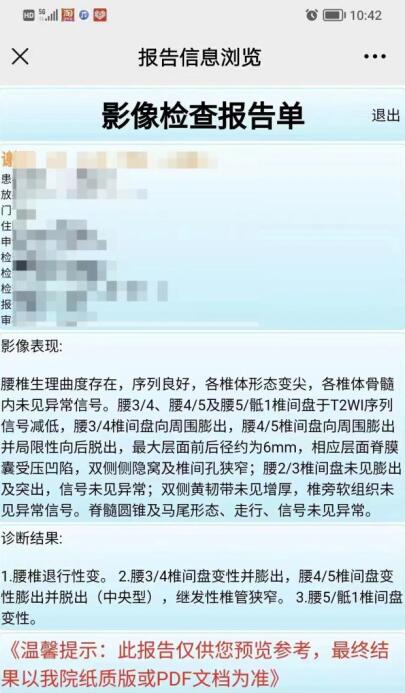 事实证明我的判断没有错,服用的第二天早上起床腰椎舒服多了,1 个疗程下来腰、屁股、大腿根上的症状缓解了很多。我从事骨科临床医学几十年,从来没有见过这么好这么快的治疗效果!按照老师的指导坚持治疗,一段时间下来我的腰突真的好了,完全没有症状了,工作一天一点事都没有!我担心这是不是暂时缓解,又在院里做了复查,这次核磁显示腰椎已经没有突出了,我师弟都觉得不可思议!